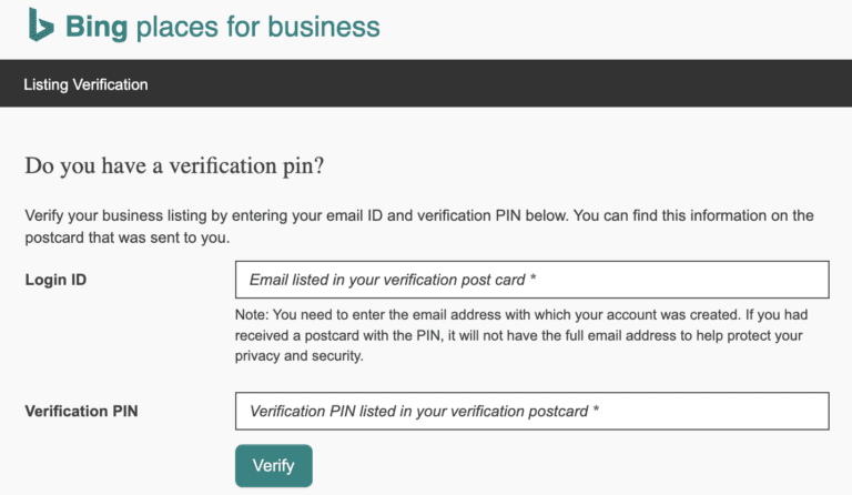7. Verify your business. Before your listing will show up in Bing results, you need to verify it. Choose a way for Bing to send you a PIN — via a phone call to your registered business phone number, an email to a business account, or receiving a postcard to your business address. Once your account is verified, you’re all ready to go.