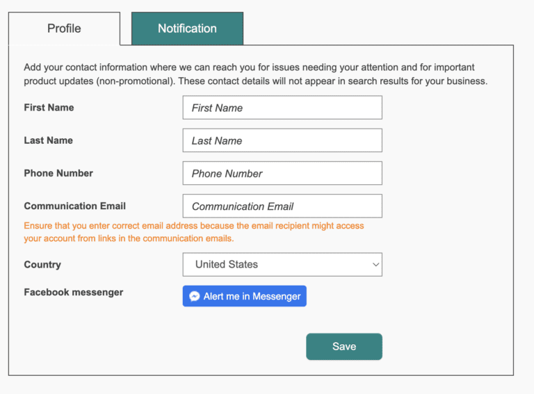 4. Add your details to create your profile. You can also change notification settings — for example, to get alerts about information that’s missing from your listing or if there are any issues with the health of your listing.
