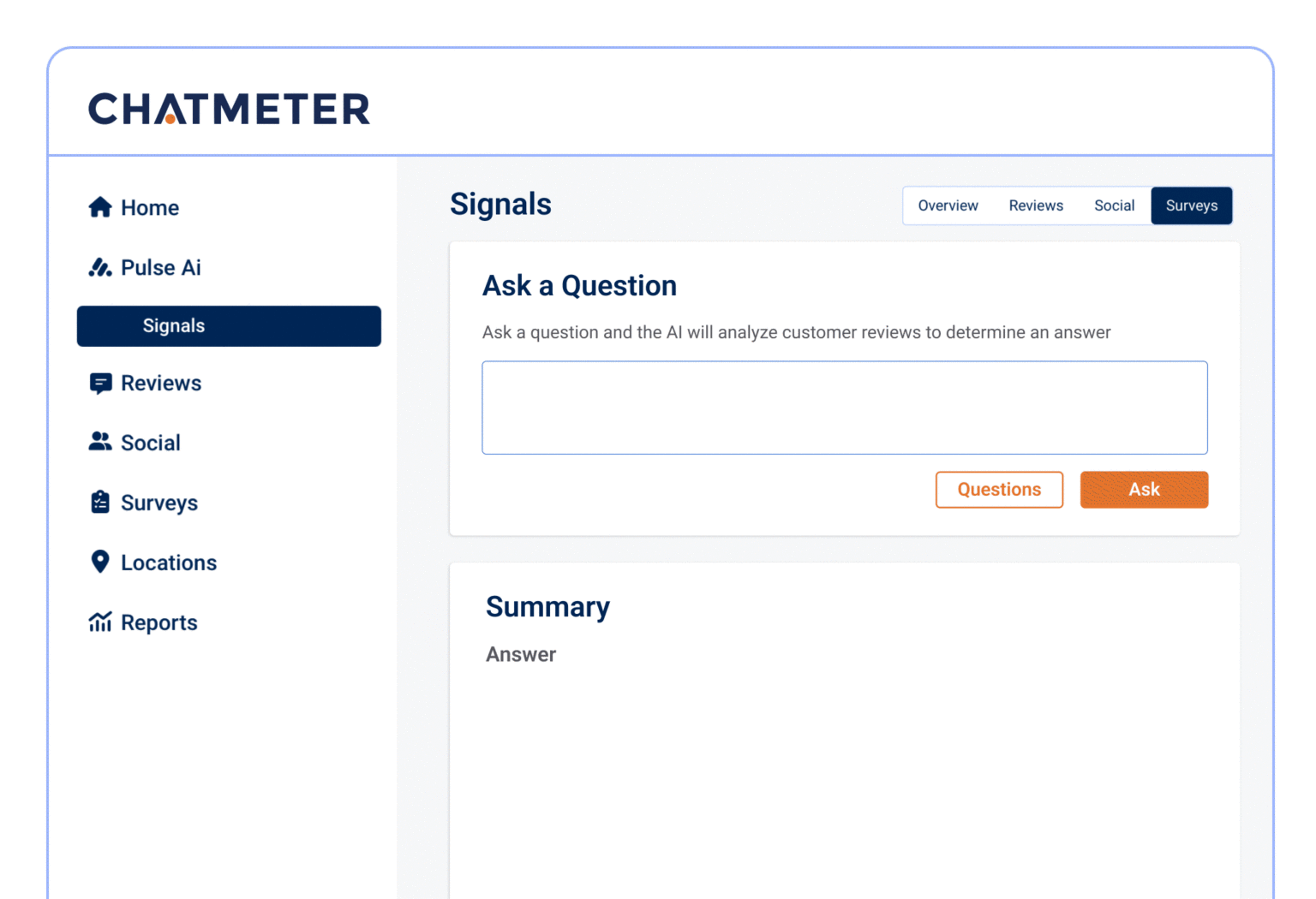 While VoC helps you categorize common themes, dedicated tools can streamline this process further. Chatmeter’s AI-powered Signals tool pulls data from your reviews, social media interactions, and more, allowing you to essentially ask “your customers” whatever you want to know about your business.